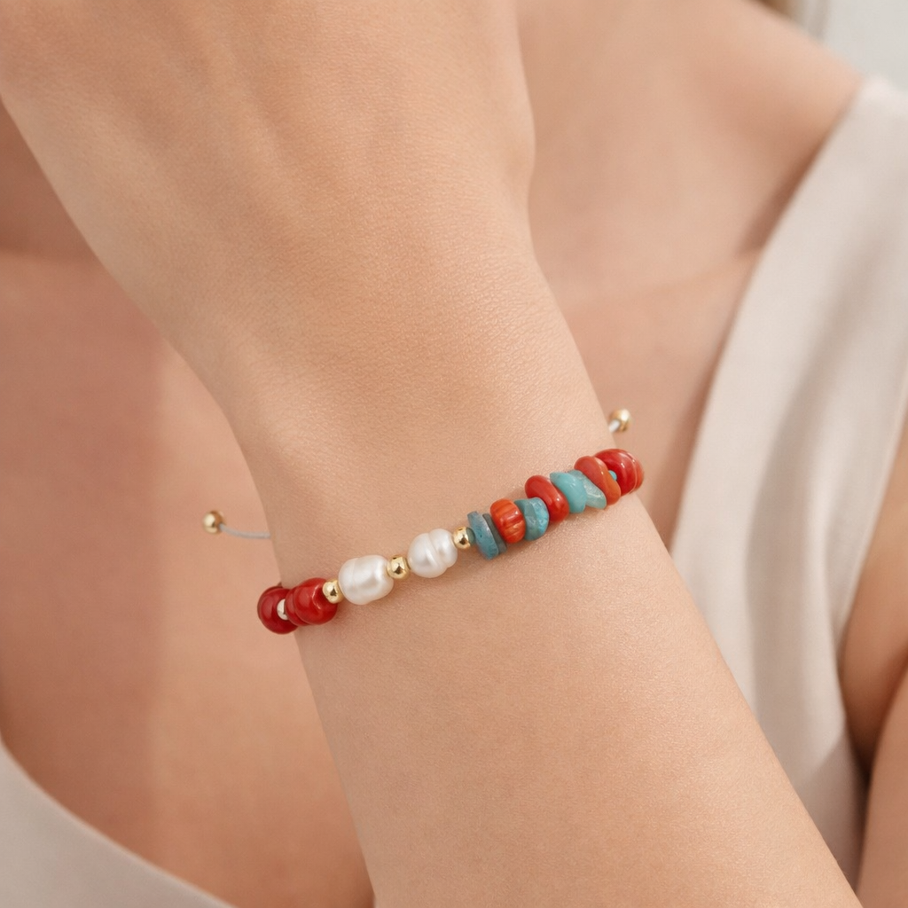 Handgefertigtes Armband aus Koralle, Türkis und echten Süßwasserperlen mit vergoldeten Details.